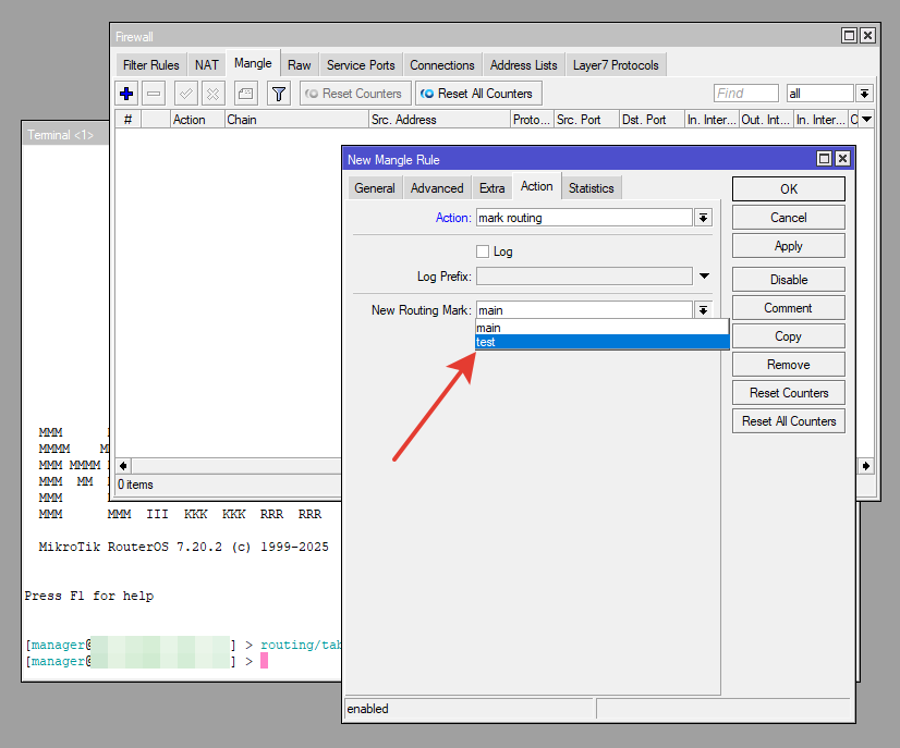 Чтобы добавить новый, дополнительный маркер, нужно открыть новый терминал и ввести следующую команду. routing/table/add name=test fib соответственно "test" это название маркера. fib обязательно добавляем через пробел иначе маркер не появится в списке mark routing.